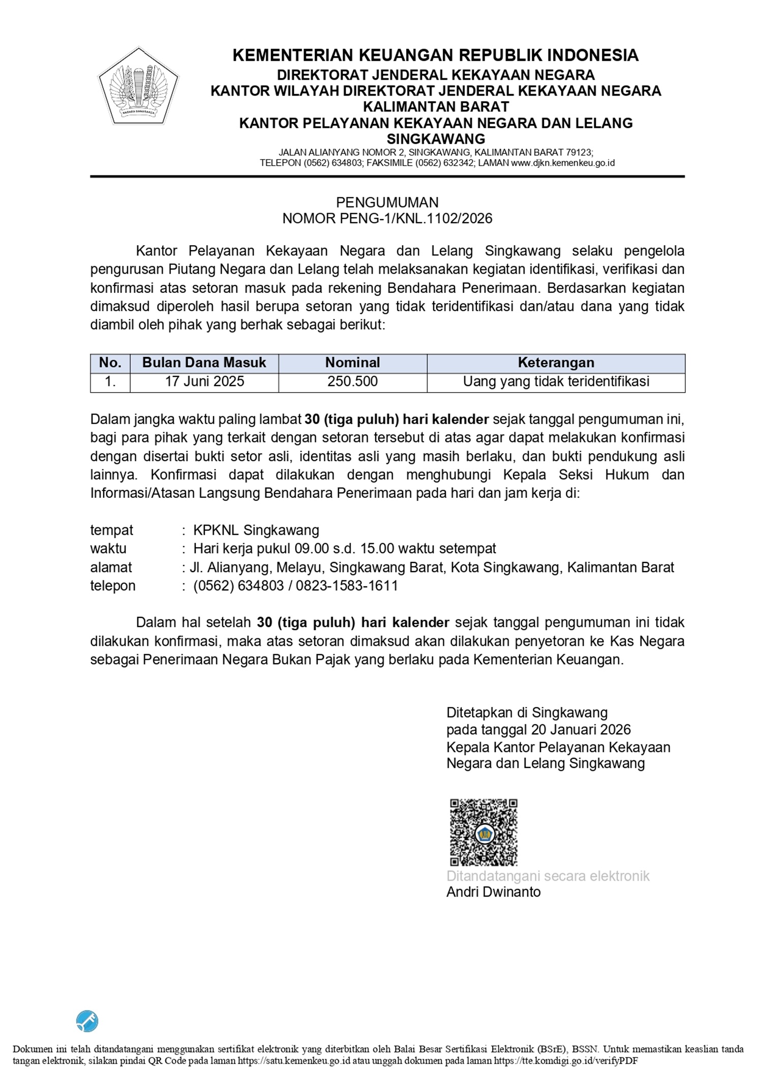 Singkawang mengimbau para pihak yang memiliki setoran sebagaimana dimaksud