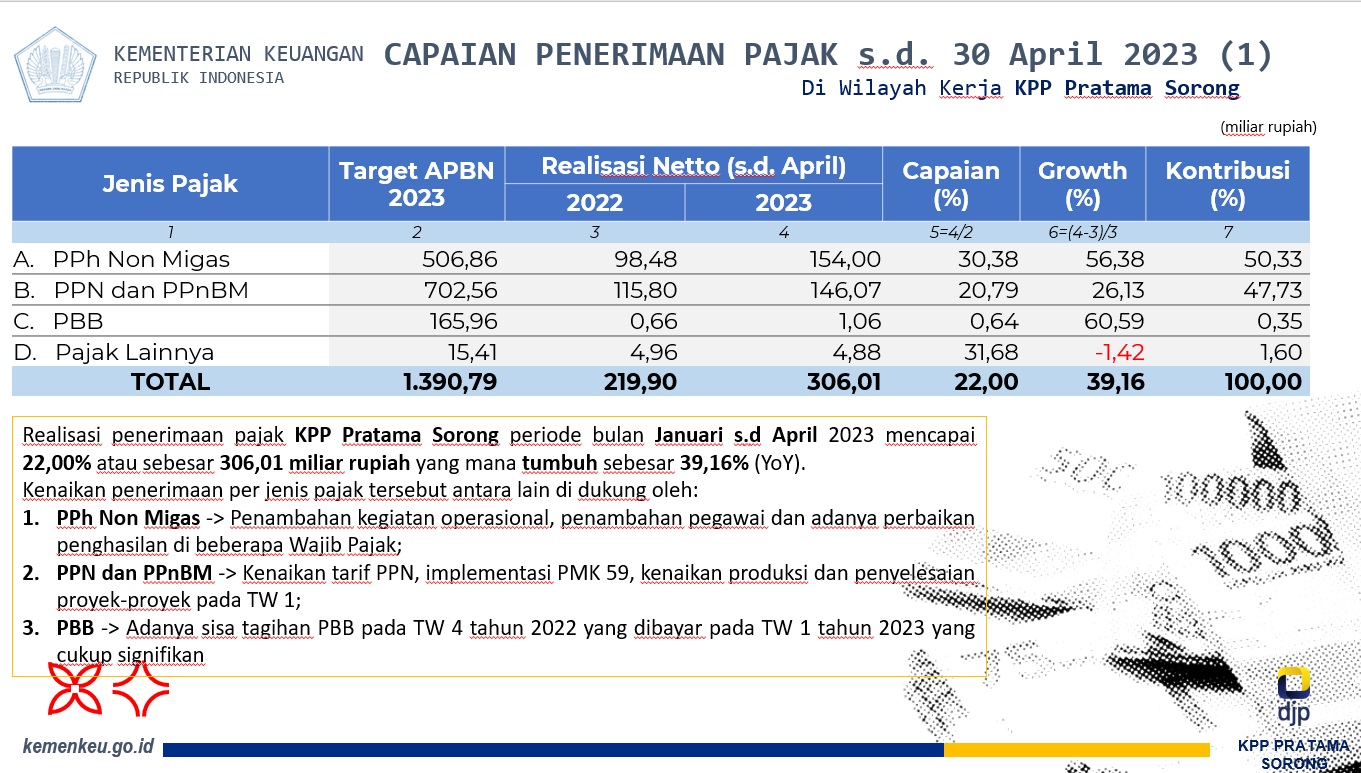 pajak KPP Pratama Sorong periode bulan Januari s.d. April 2023 mencapai 22,00