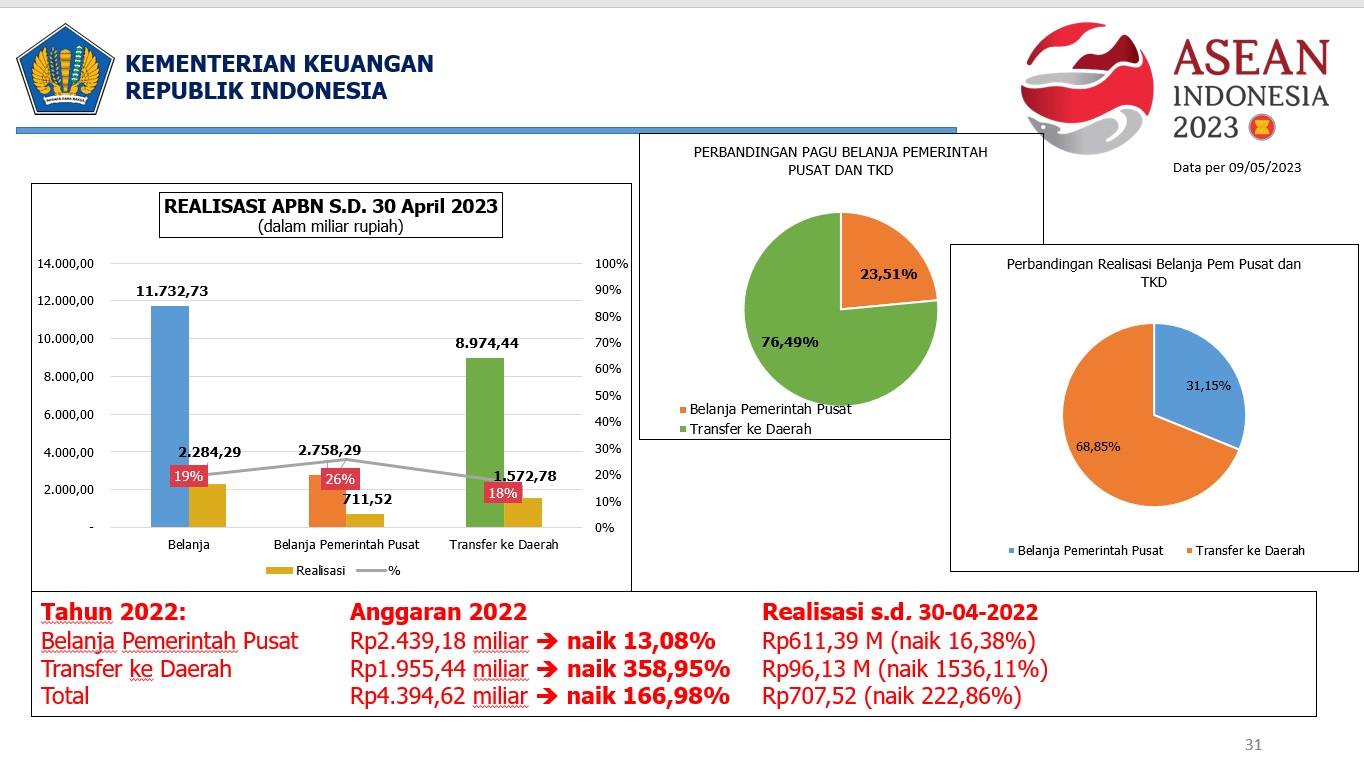 Dari sisi belanja, sampai dengan 30 April 2023 realisasi belanja APBN di