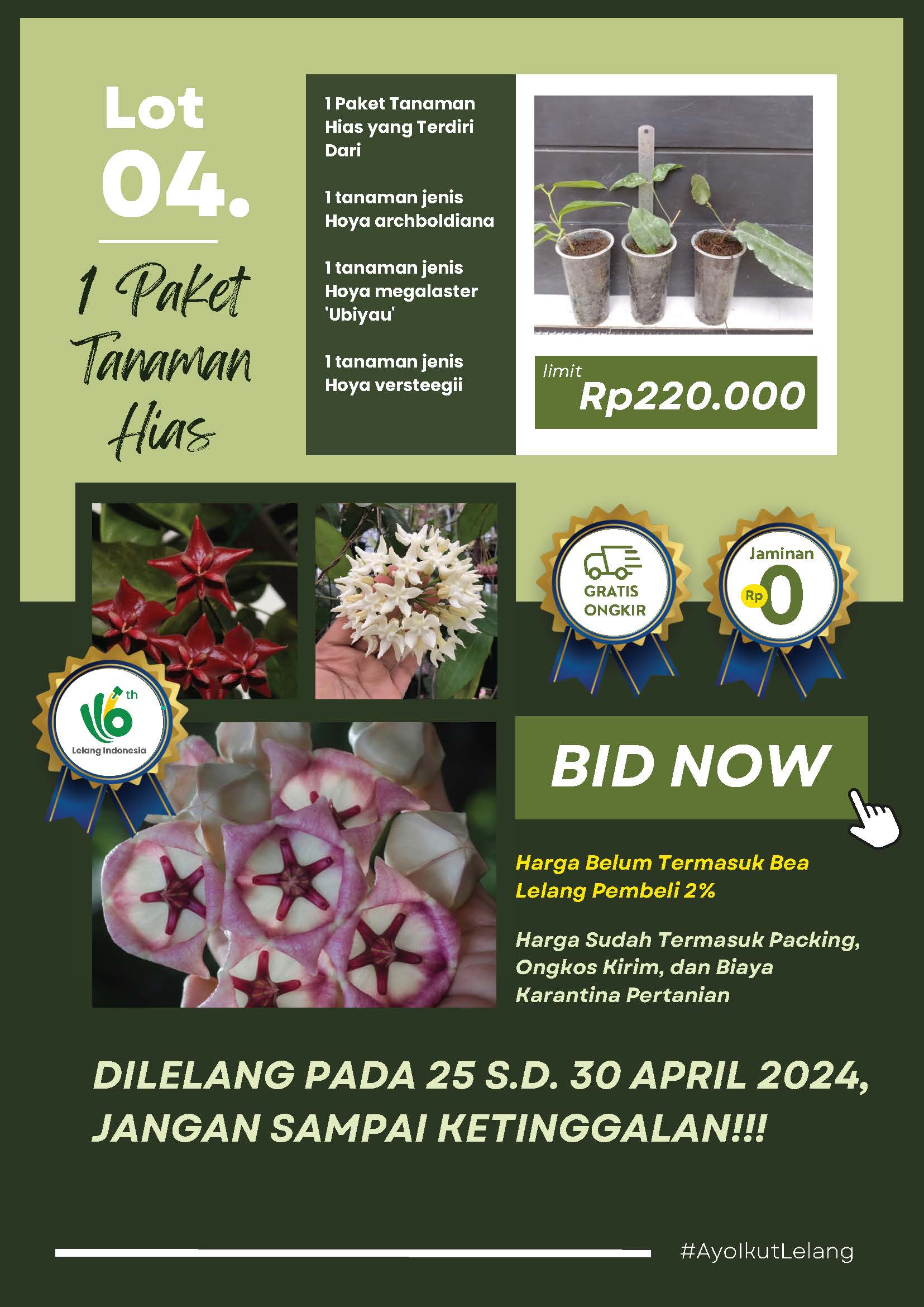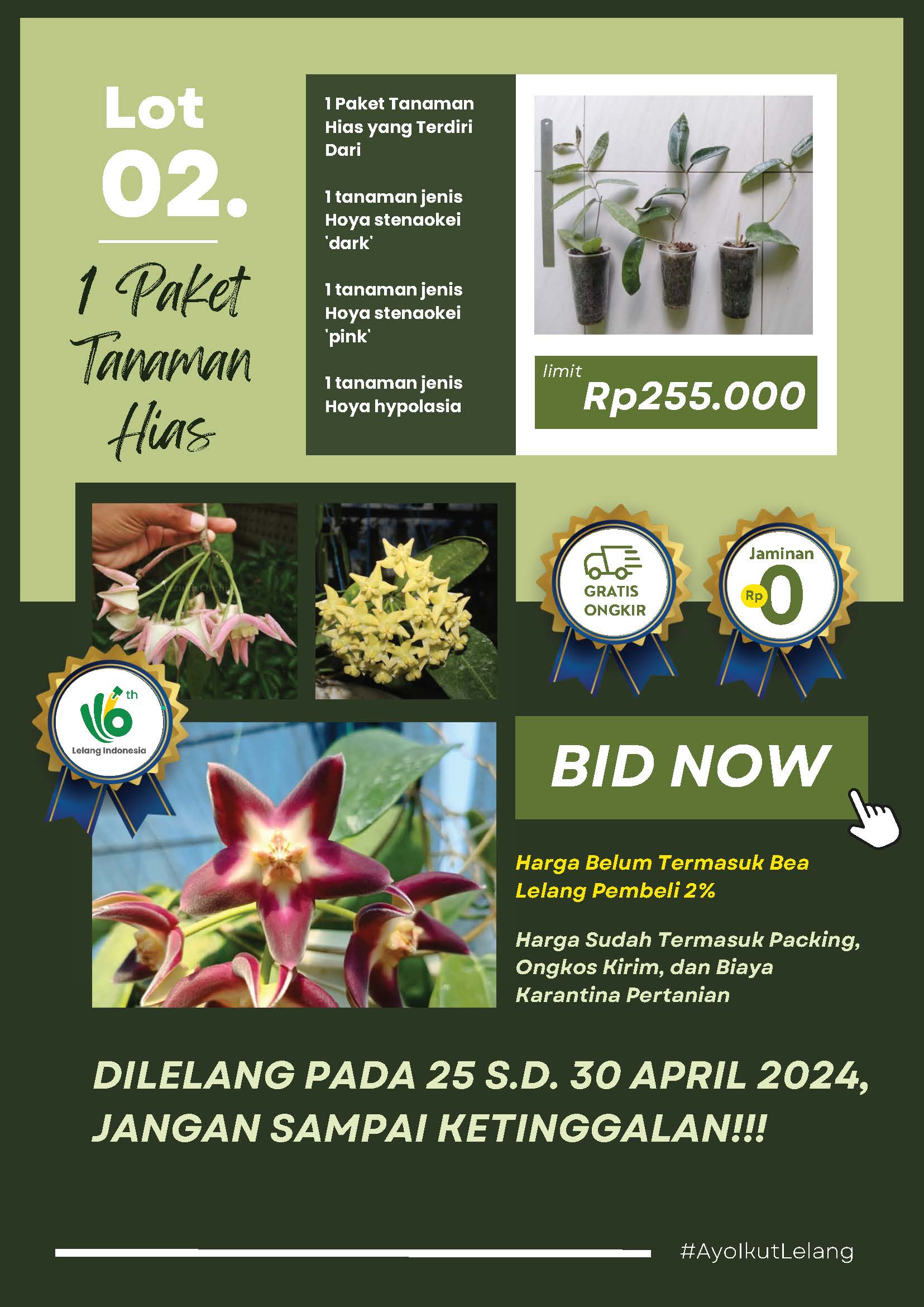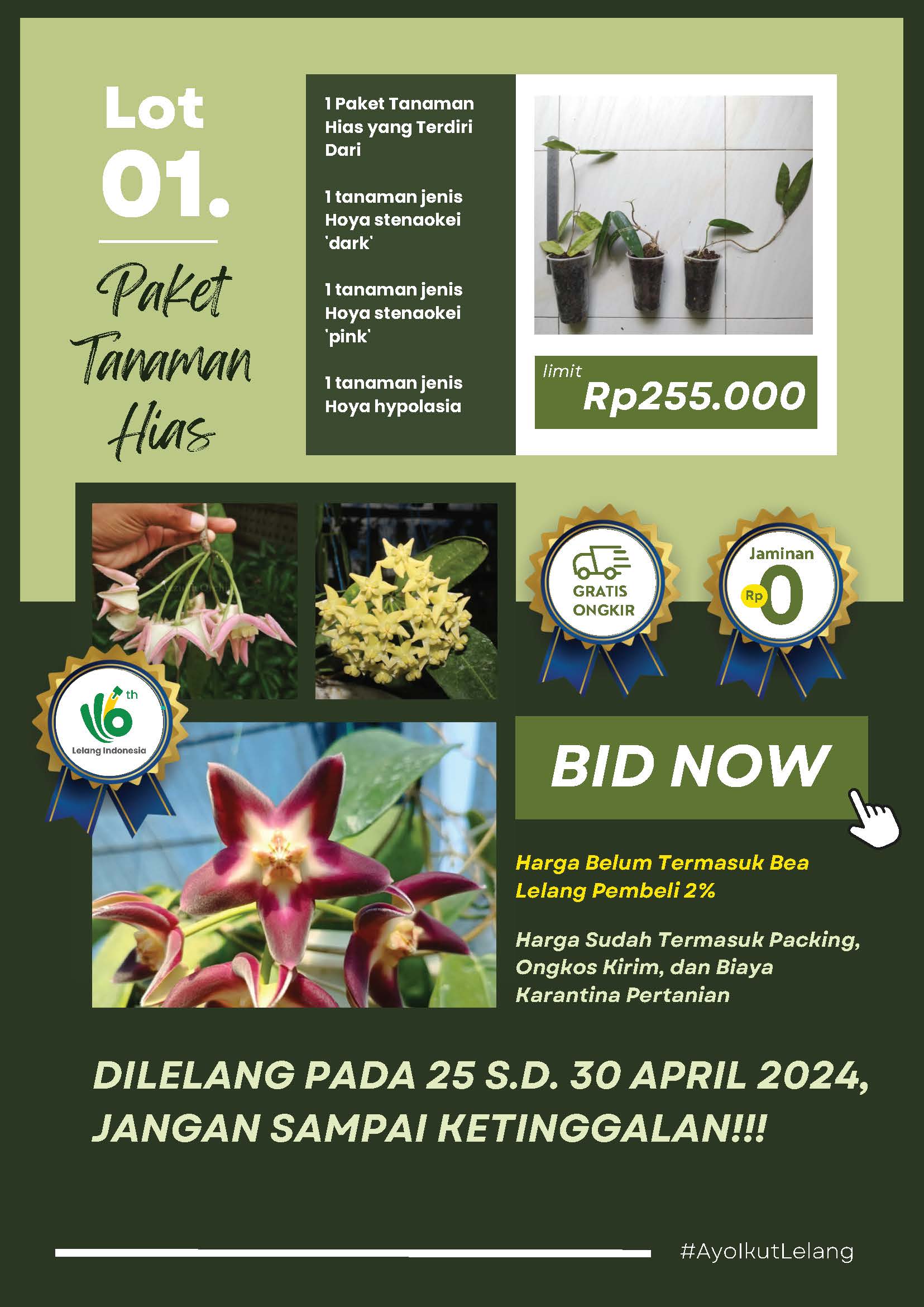 155.000,00. Jenis tanaman hias yang dilelang antara lain hoya stenaokei dark, hoya stenaokei pink, hoya hypolasia, hoya