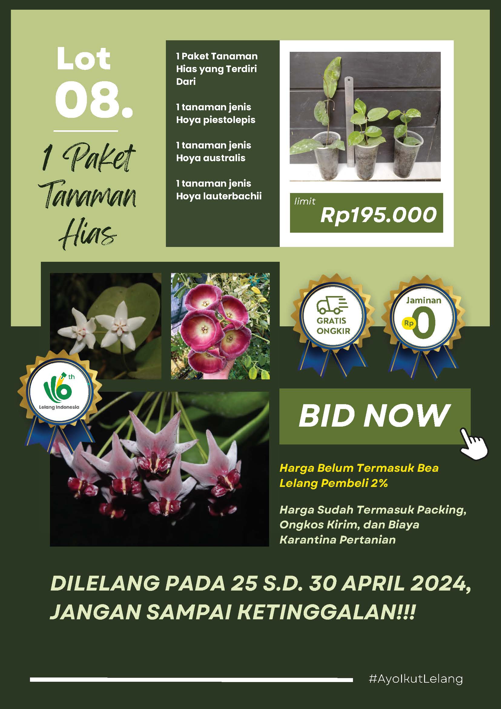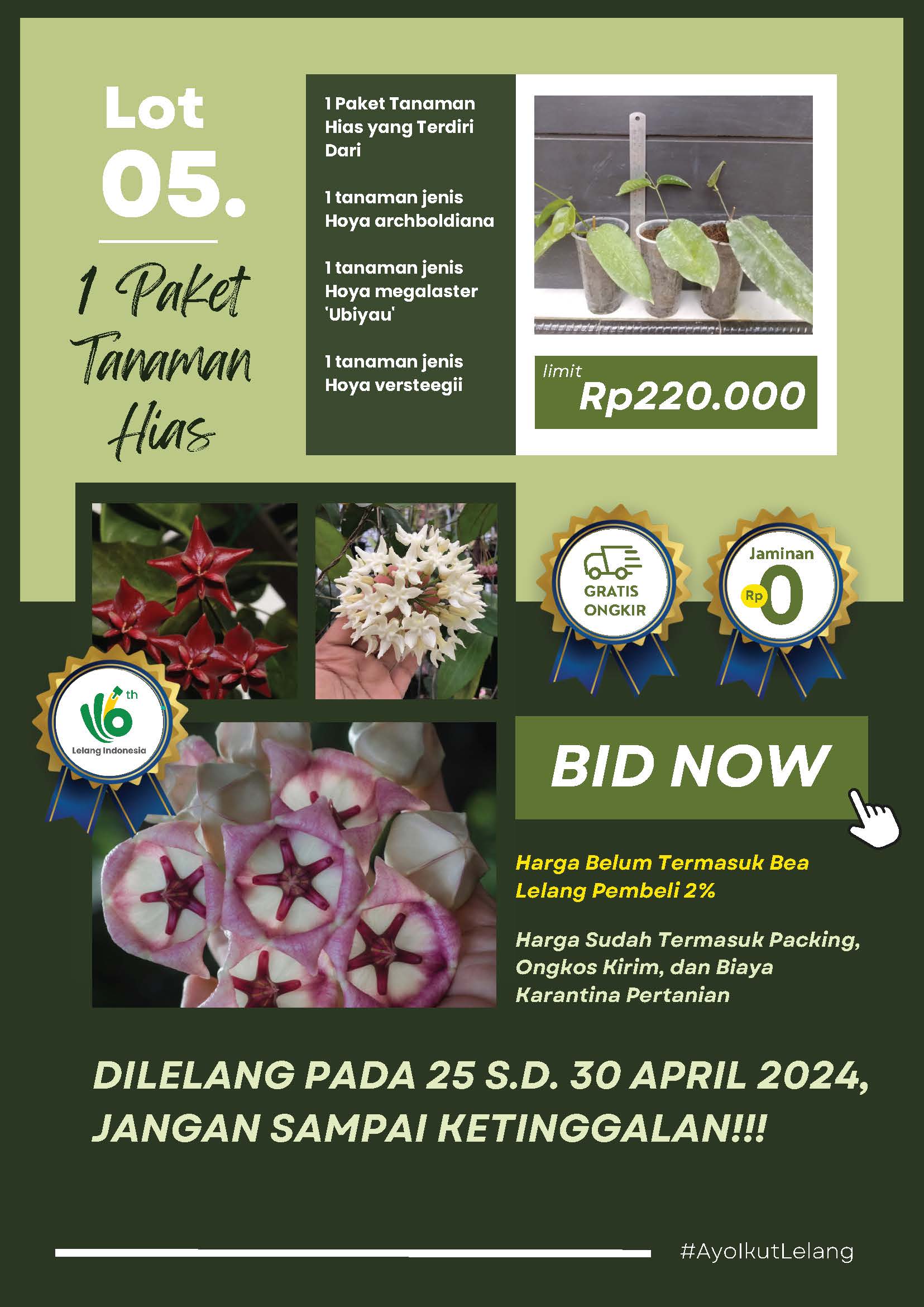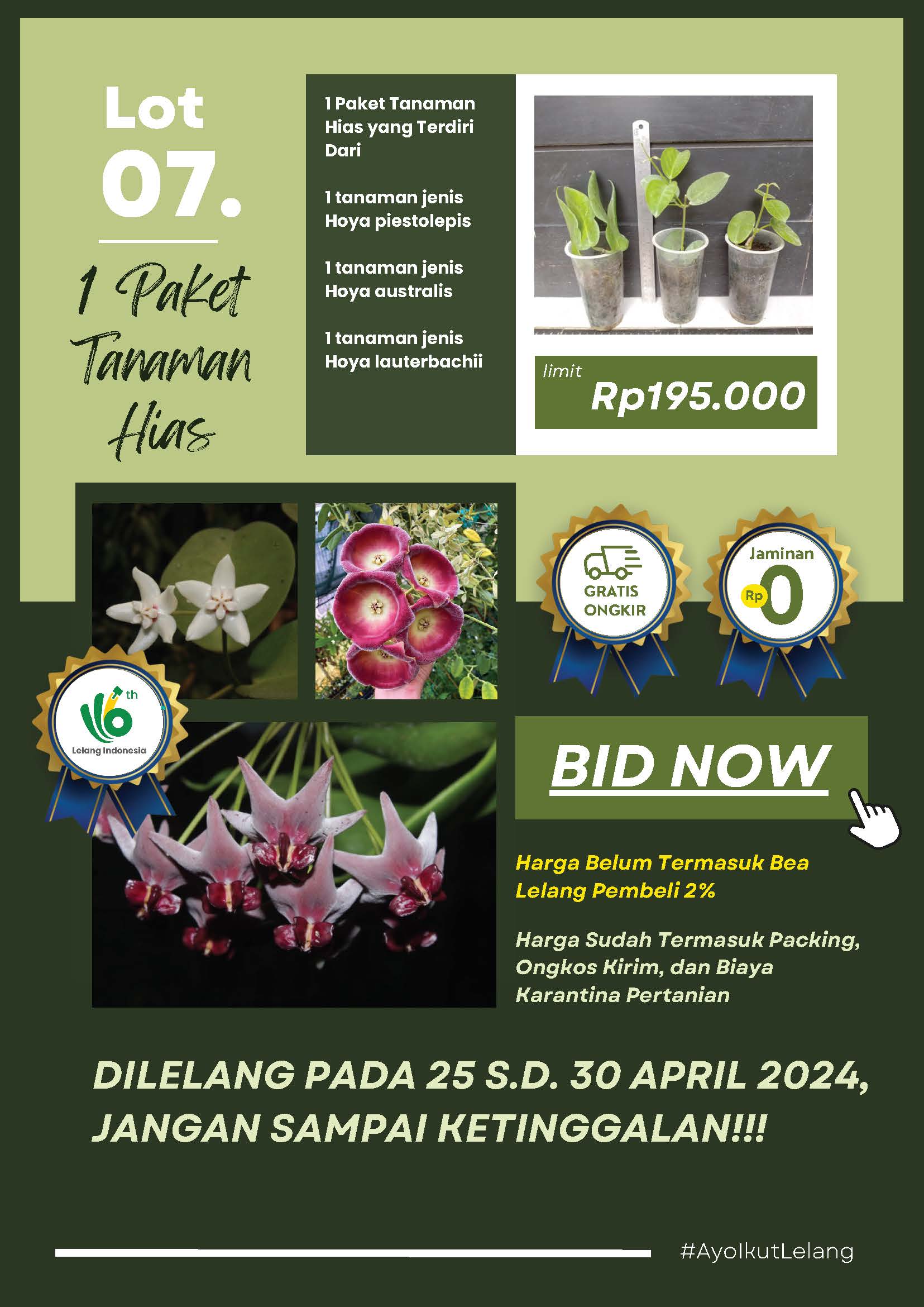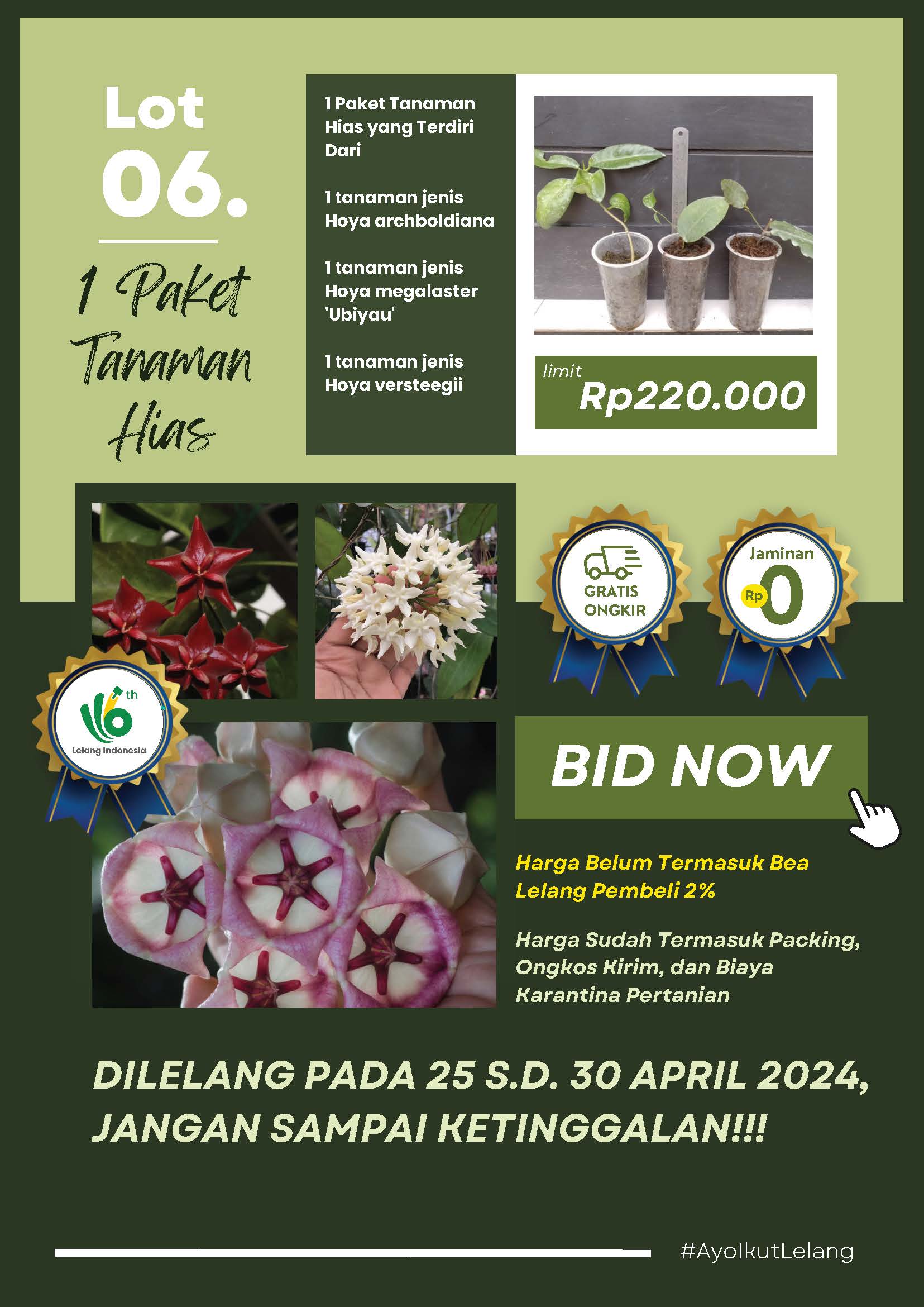 155.000,00. Jenis tanaman hias yang dilelang antara lain hoya stenaokei dark, hoya stenaokei pink, hoya hypolasia, hoya