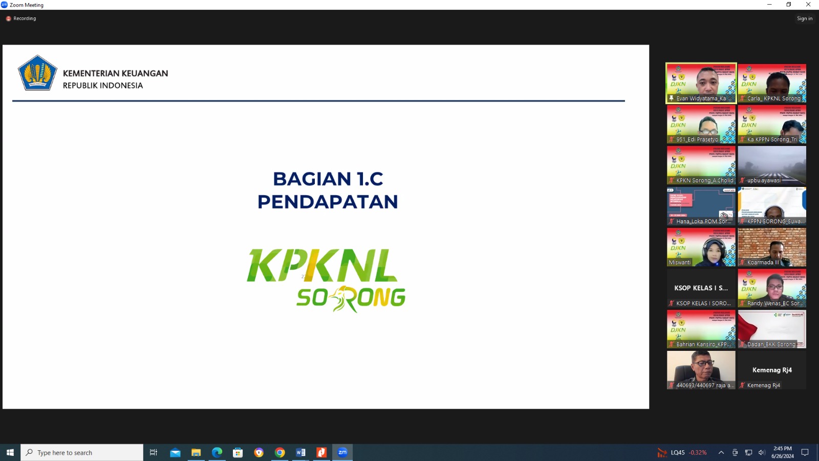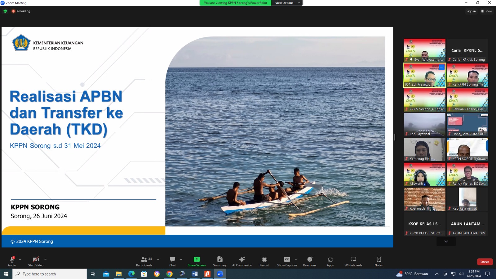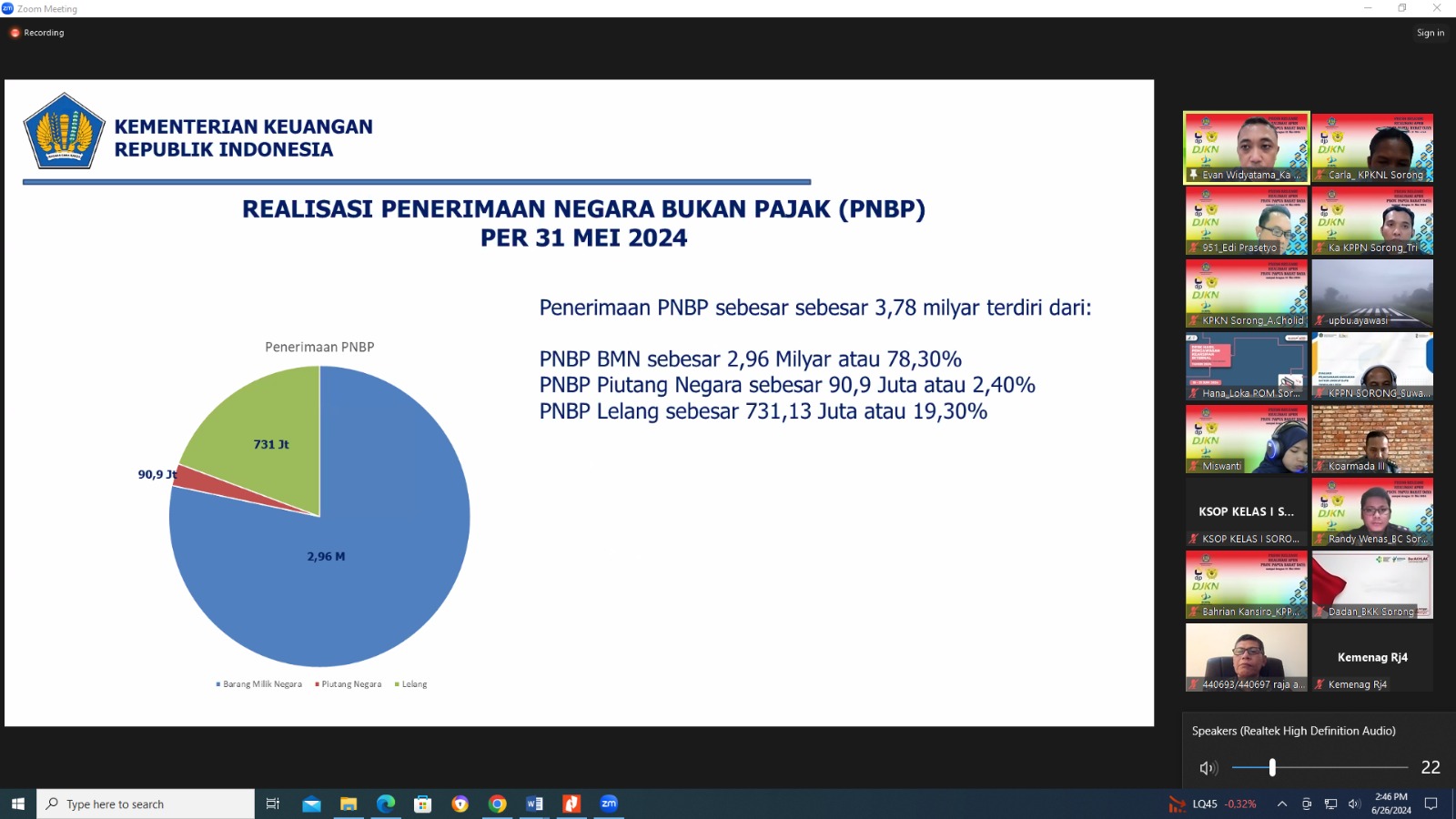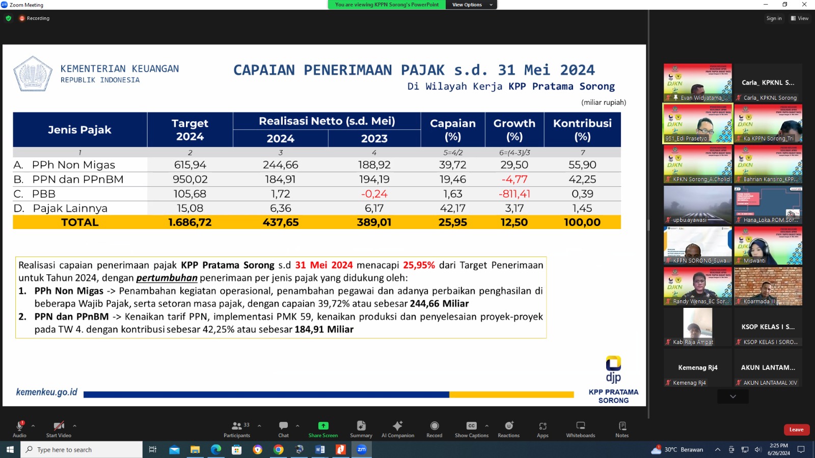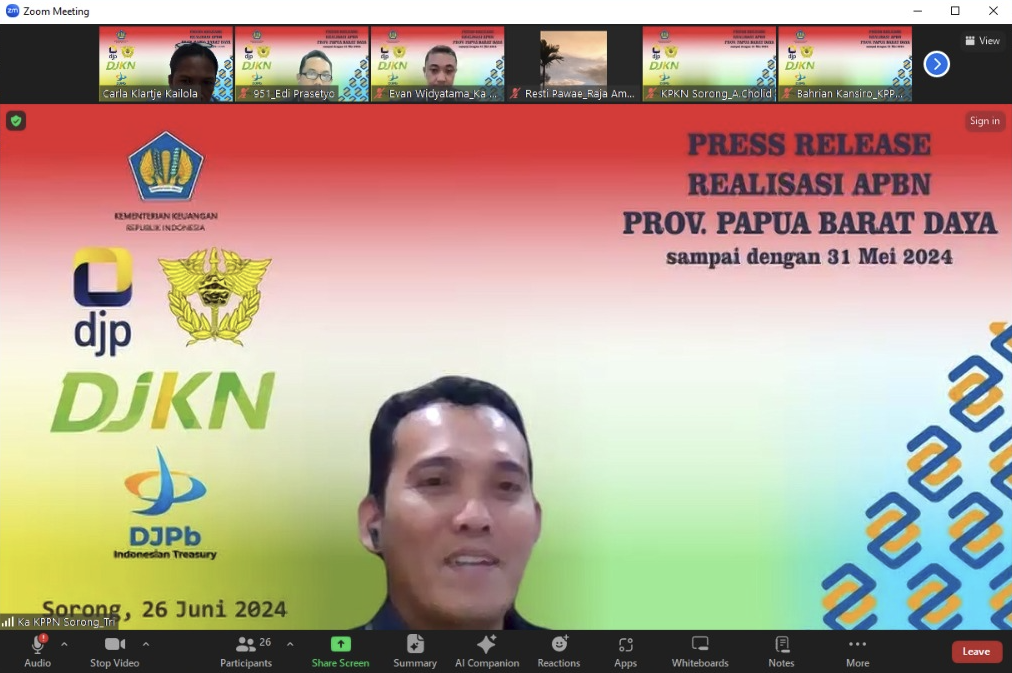 Sorong (26/6) Kemenkeu Satu menyampaikan Siaran Pers Realisasi APBN Provinsi Papua Barat Daya sampai bulan Mei 2024 secara daring melalui aplikasi zoom meeting. Siaran Pers dihadiri oleh seluruh pimpinan Kementerian Keuangan Perwakilan Provinsi Papua Barat Daya, Perwakilan satuan kerja dan para wartawan yang diundang. Siaran Pers dibacakan secara bergantian oleh KPP Pratama Sorong, KPPBC TMP C Sorong, KPKNL Sorong dan KPPN Sorong.