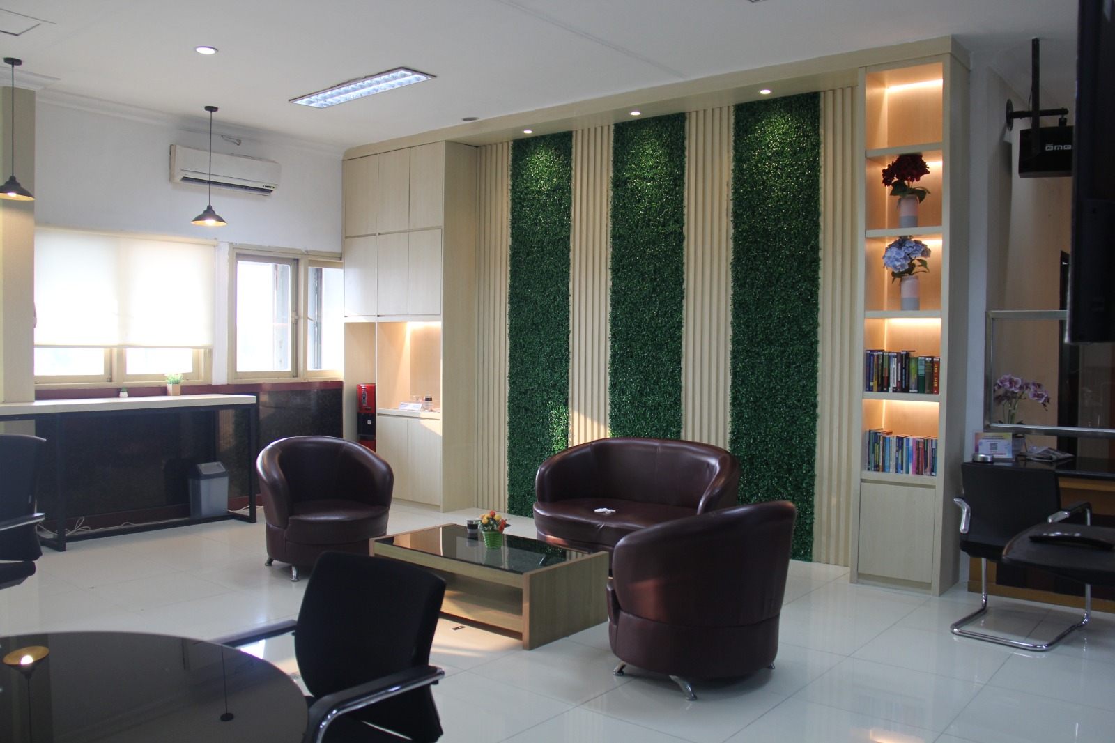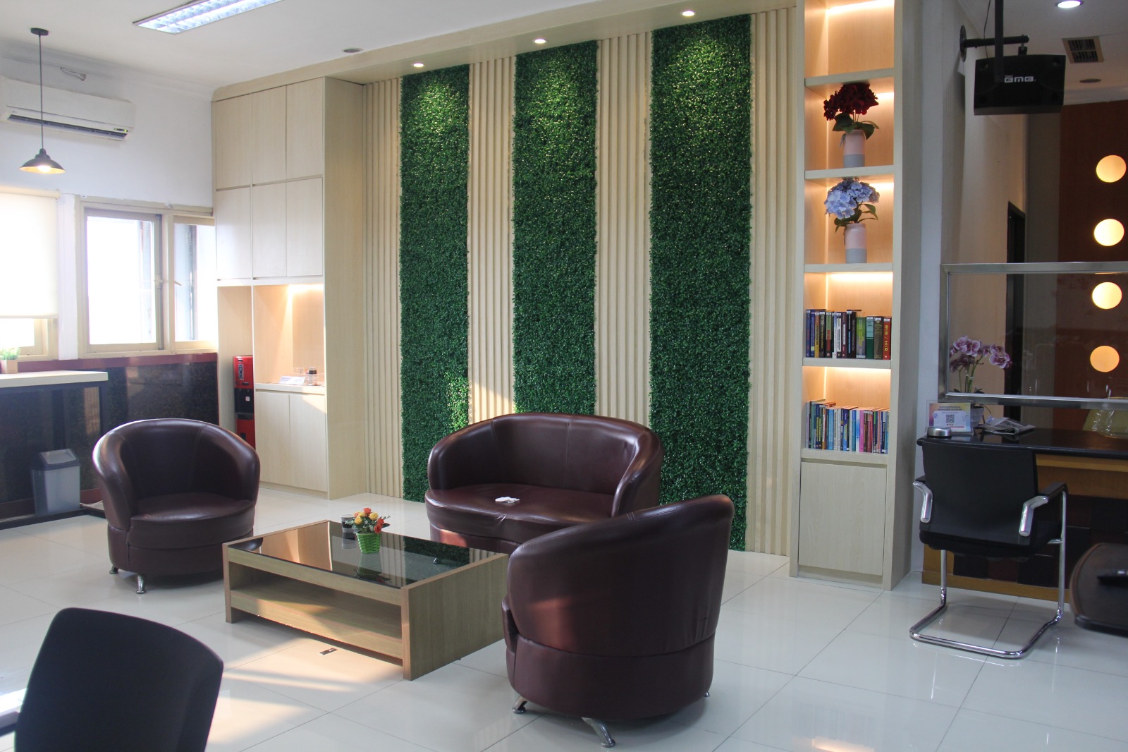 lokasi ditempatkan tanaman berbentuk vertial garden dengan tanaman yang berbentuk kolam mini dengan dikelilingi tanaman. Disamping
