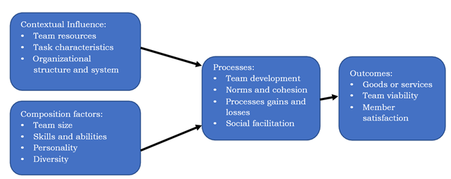 Neck et al. (2017) stated that teams will be effective if their capacity can improve quality and simplify processes that eventually achieve organizational goals. One method to analyze teams effectiveness is to examine them through a set of contextual factors that affect their function, composition, processes, and outcomes. The following figure demonstrates the impact of these factors on team effectiveness.