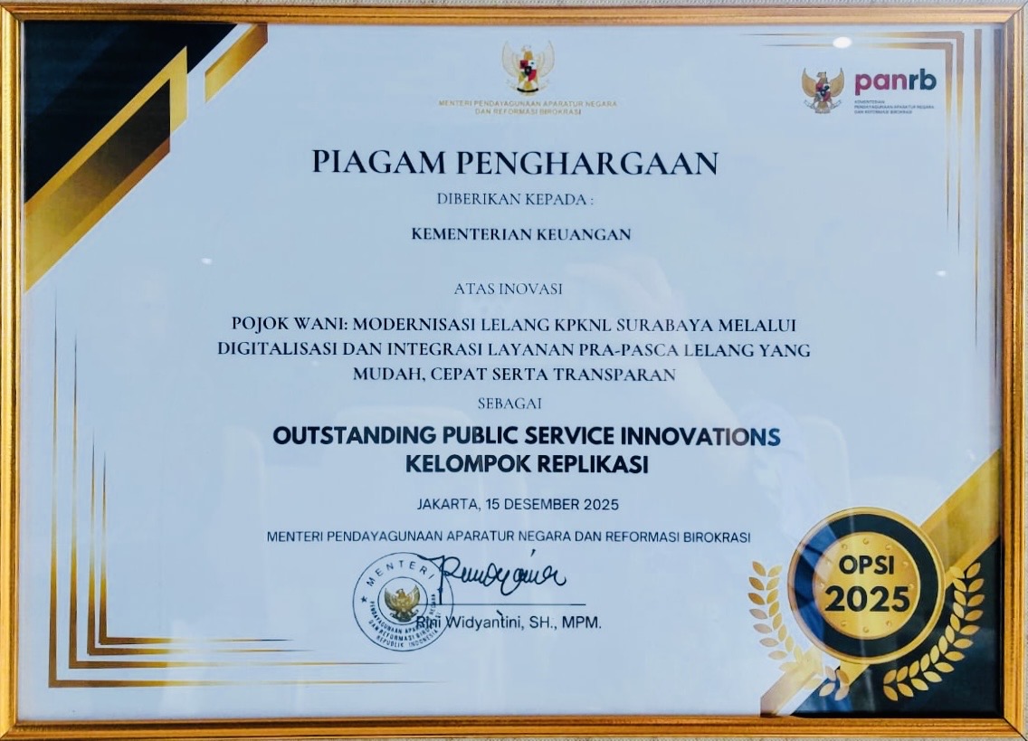 Sepanjang tahun 2025, KPKNL Surabaya berhasil menorehkan berbagai prestasi membanggakan di tingkat internal DJKN sampai nasional. Capaian tersebut merupakan hasil dari komitmen berkelanjutan dalam menghadirkan layanan publik yang inovatif, inklusif, transparan, serta didukung oleh sumber daya manusia yang profesional dan berintegritas.