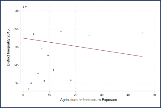 Untuk menunjukkan apakah memang infrastrukur itu memiliki peran dalam menopang kondisi ekonomi, Gambar 5 berikut ini mengilustrasikan bahwa daerah dengan eksposure infrastruktur pertanian yang tinggi ternyata cenderung memiliki tingkat kesenjangan pendapatan yang menurun. Menurunnya gap kesenjangan merupakan salah satu indikator dimana sektor dengan performa rendah, seperti pertanian, mengalami peningkatan produktifitas setelah adanya pembangunan infrastruktur, seperti bendungan dan irigasi.