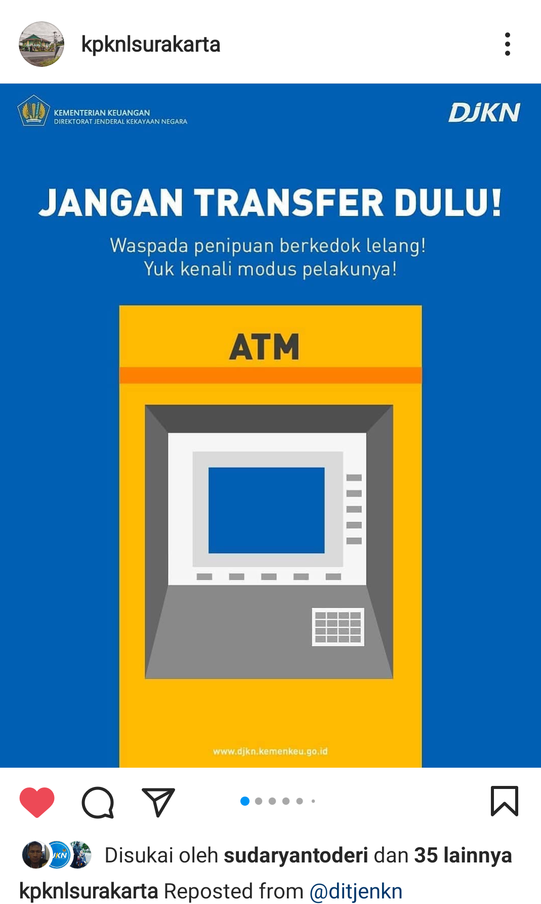 Lelang DJKN/KPKNL tidak pernah menggunakan rekening atas nama pribadi/perorangan. Lelang DJKN/KPKNL yang resmi adalah melalui www.lelang.go.id. Untuk memperoleh informasi lebih detil, masyarakat dapat menghubungi KPKNL terdekat. Untuk wilayah Solo Raya, dapat menghubungi KPKNL Surakarta, alamat Jalan Ki Mangunsarkoro nomor 141 Surakarta, Telpon: 0271-723644.