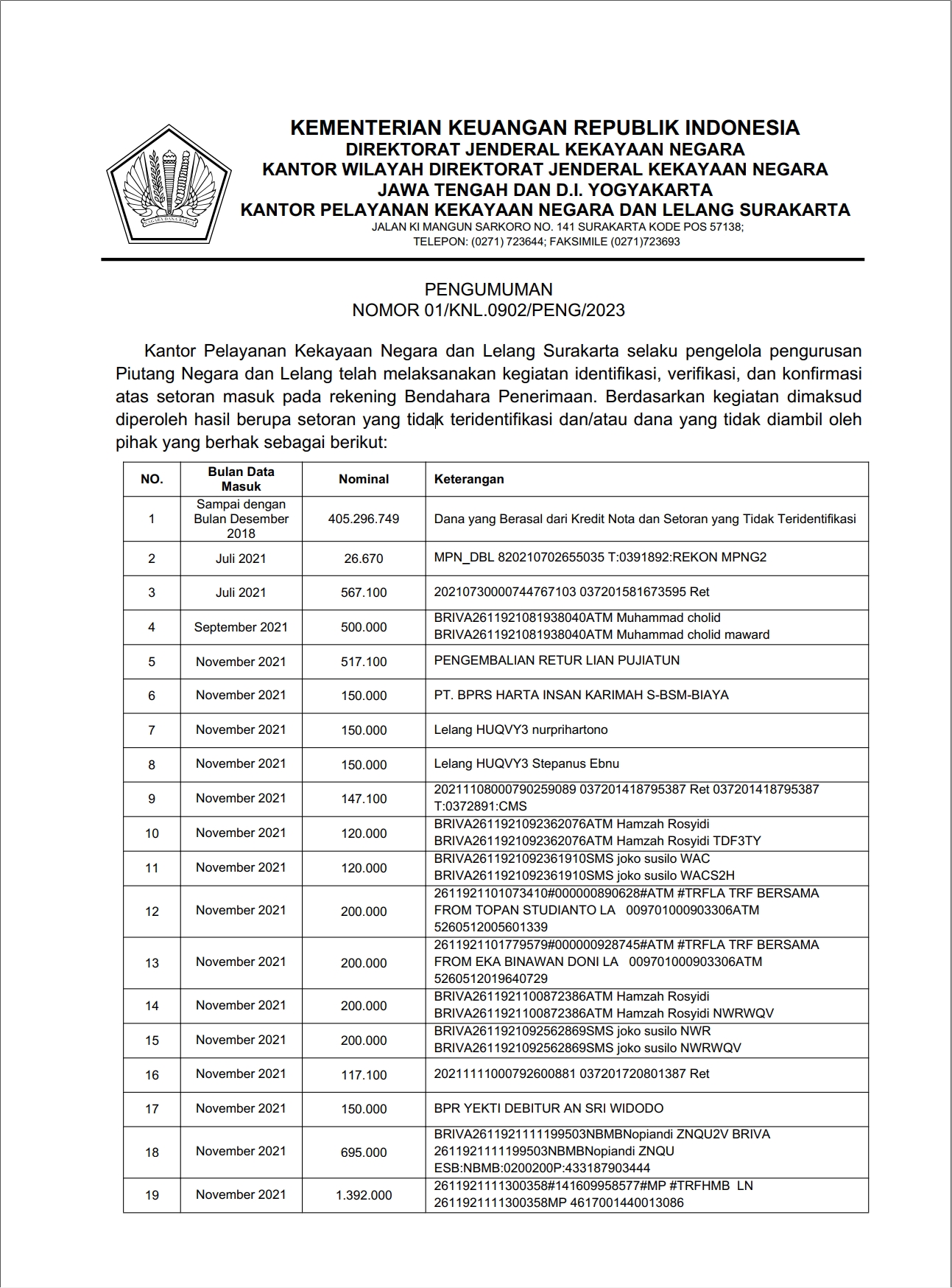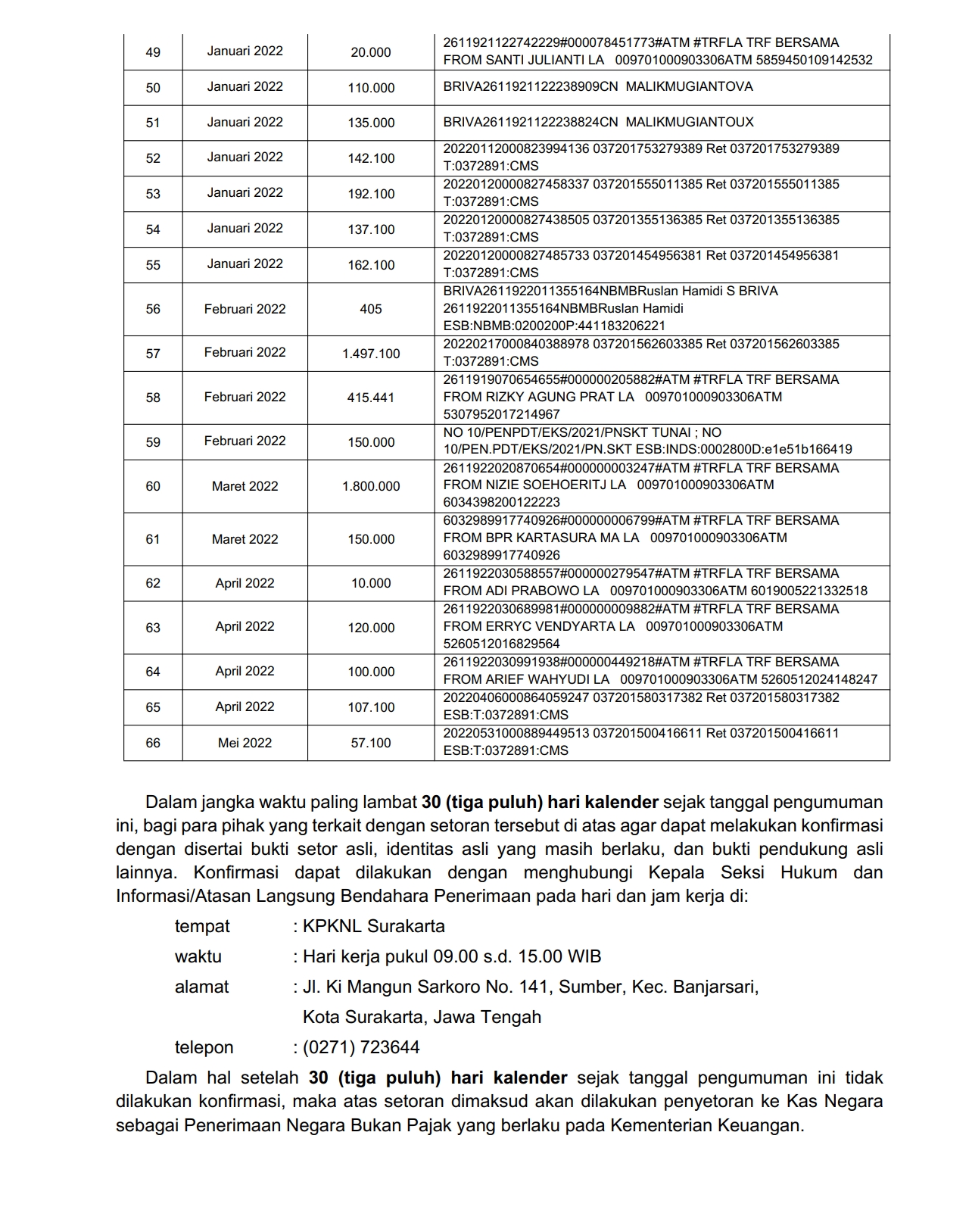 Pengumuman Hasil Identifikasi, Verifikasi dan Konfirmasi Setoran pada Rekening Lelang KPKNL Surakarta