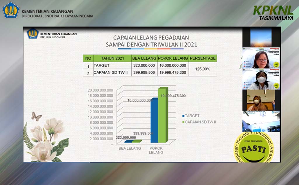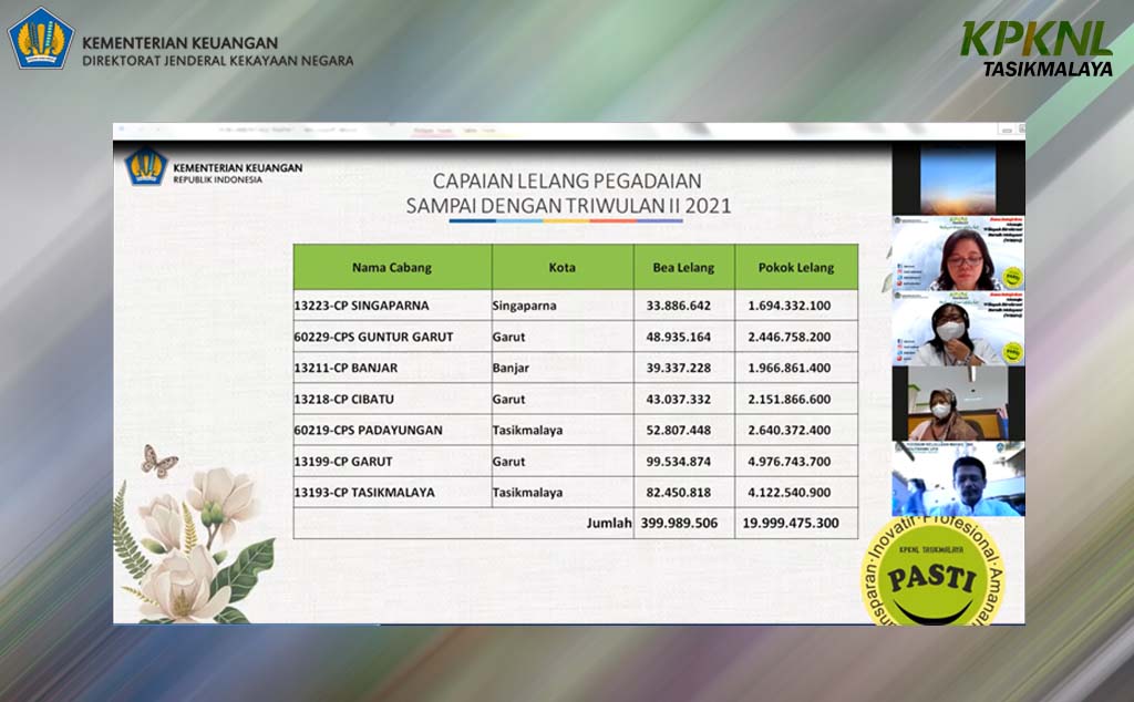 Kemudian, acara dilanjutkan dengan Penyampaian Capaian Kinerja Lelang Pegadaian sampai dengan Triwulan II Tahun 2021 oleh Kepala Seksi Pelayanan Lelang, Y. Tri Astuti. Dalam paparannya tersebut disampaikan bahwa pada tahun 2021, target Pokok Lelang Pegadaian di KPKNL Tasikmalaya adalah sebesar Rp16.000.000.000,00 dan Bea Lelang Pegadaian sebesar Rp323.000.000,00. Dari target tersebut, Pegadaian telah menyempurnakan capaian targetnya di Triwulan II Tahun 2021 ini. Kontribusi terbanyak berasal dari PT.Pegadaian CP Garut dengan total pokok lelang yang diperoleh sebesar Rp4.976.743.700 dan bea lelang sebesar Rp99.534.874,00, disusul dengan PT Pegadaian CP Tasikmalaya dengan total pokok lelang yang diperoleh sebesar Rp4.122.540.900,00 dan bea lelang sebesar Rp82.450.818,00, dan berturut-turut PT. Pegadaian CPS Padayungan, PT. Pegadaian CPS Guntur Garut, PT. Pegadaian CP Cibatu, PT. Pegadaian CP Banjar, dan PT. Pegadaian CP Singaparna.