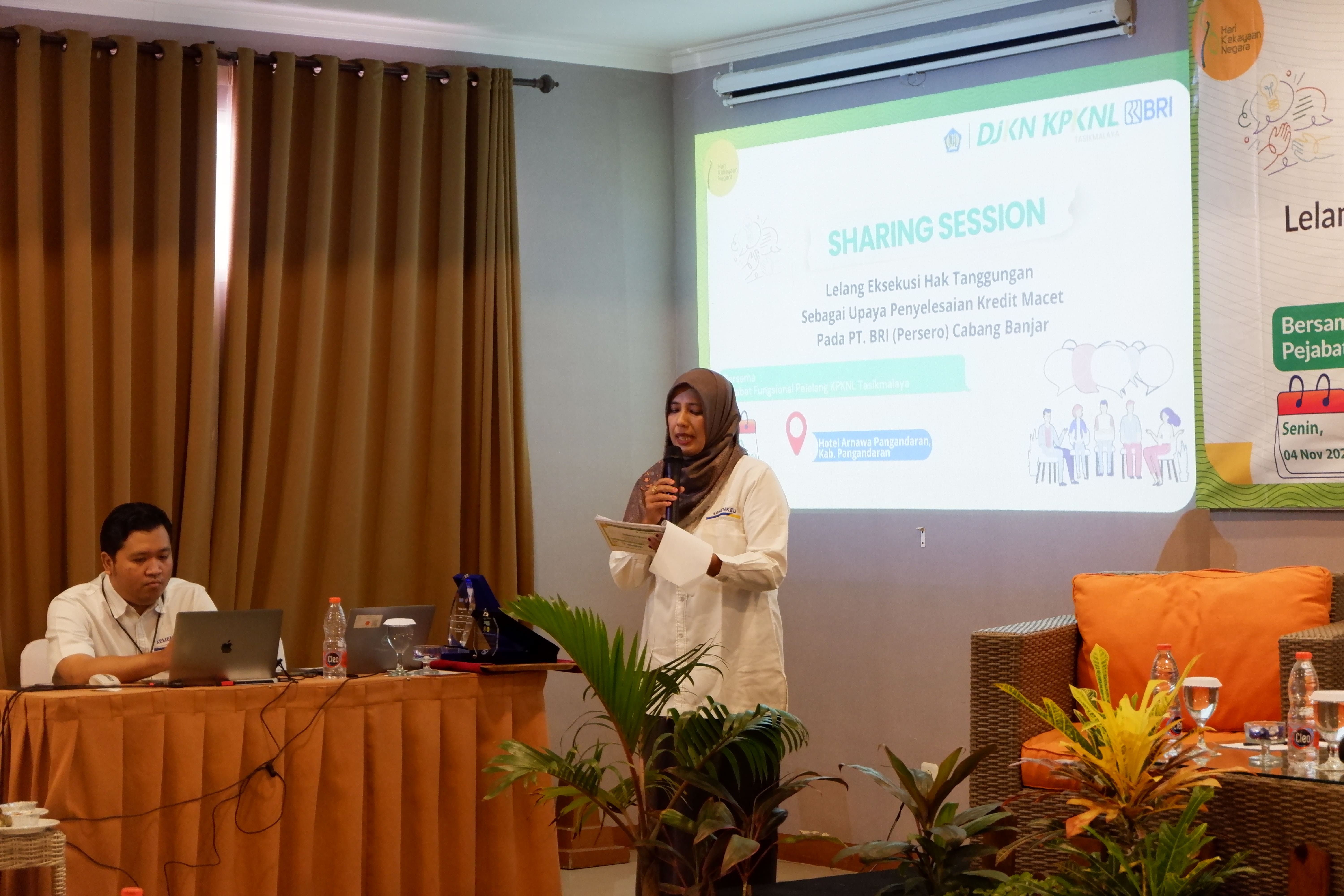 Dalam rangka memperingati dan menggaungkan tema HUT DJKN ke 18 yaitu Transformasi Pelayanan Menuju Indonesia Maju, Agustina Lies Rahayu Pelelang Ahli Muda KPKNL Tasikmalaya selaku pembawa acara bersama seluruh Pelelang KPKNL Tasikmalaya hadir dalam acara ini dalam upaya penyelesaian kredit macet pada lelang eksekusi hak tanggungan. Agustina Lies Rahayu menyampaikan agenda pada hari itu ialah pembukaan, sambutan Kepala KPKNL Tasikmalaya dan Pemimpin Cabang PT BRI Banjar, materi, sesi tanya jawab/diskusi, dan penutup. Sharing Session materi disampaikan oleh Pelelang Ahli Muda KPKNL Tasikmalaya mengenai Lelang Eksekusi Hak Tanggungan sebagai Upaya Penyelesaian Kredit Macet oleh Dani Hari Mulyo dan Bedah Dokumen Persyaratan Lelang Eksekusi Pasal 6 UUHT oleh Maryoso.
