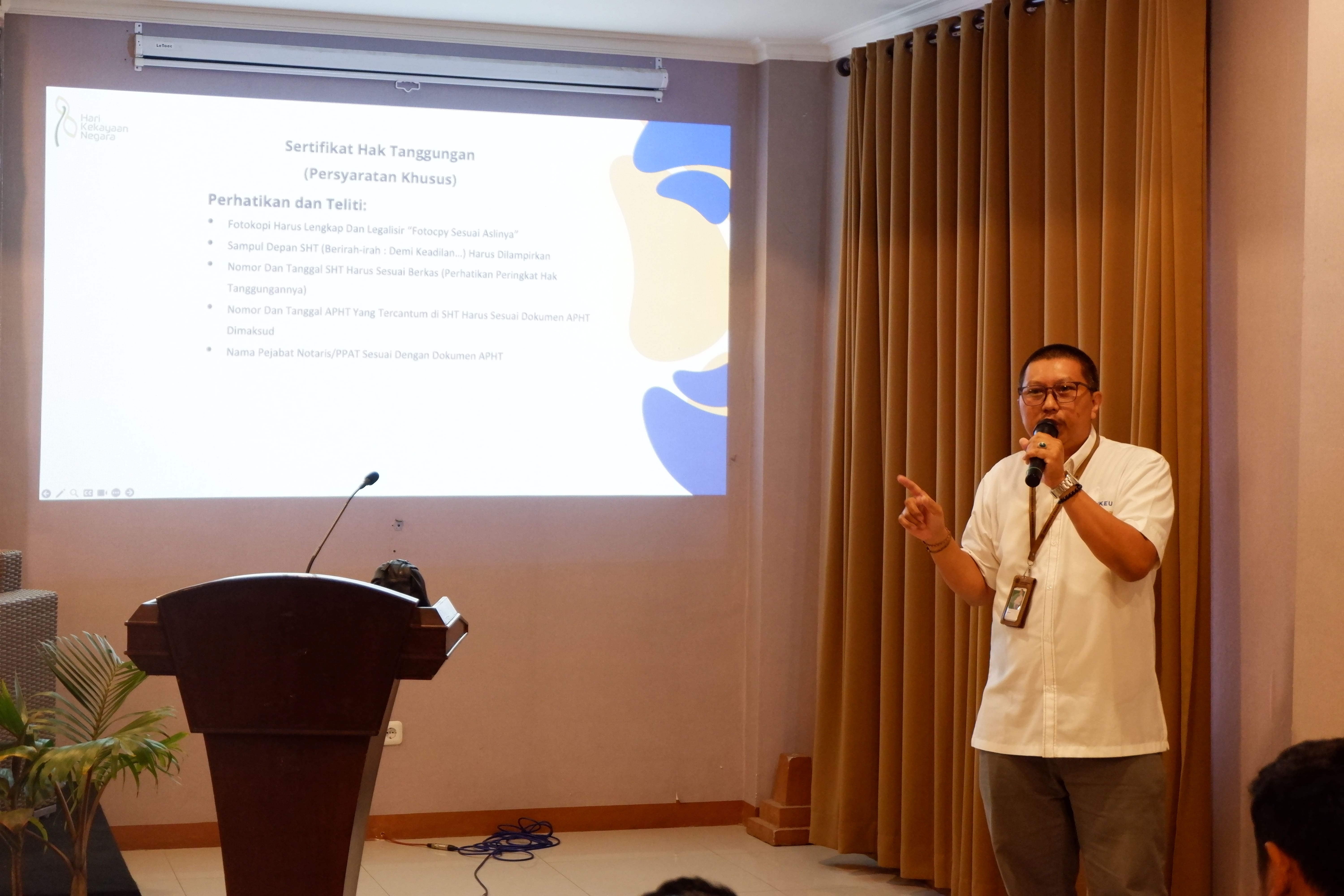 Agenda utama yaitu materi pertama mengenai Lelang Eksekusi Hak Tanggungan sebagai Upaya Penyelesaian Kredit Macet oleh Dani Hari Mulyo disampaikan definisi lelang, Hak Tanggungan, Lelang Eksekusi objek Hak Tanggungan sesuai Pasal 6 UUHT, syarat dan mekanisme eksekusi, dan tahapan proses lelang dari awal hingga akhir.