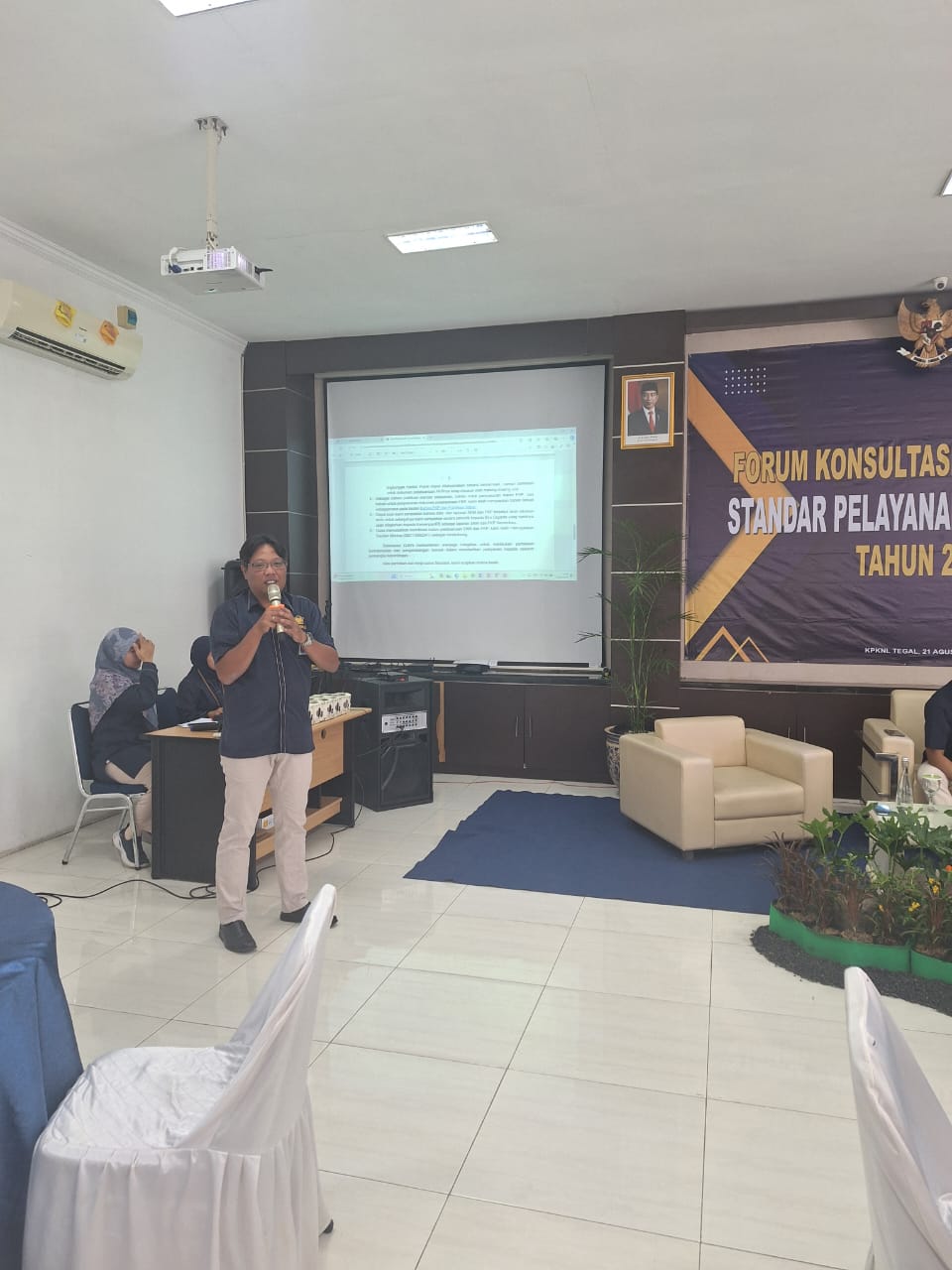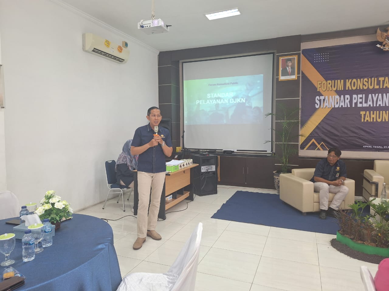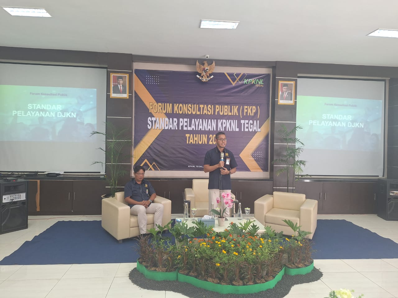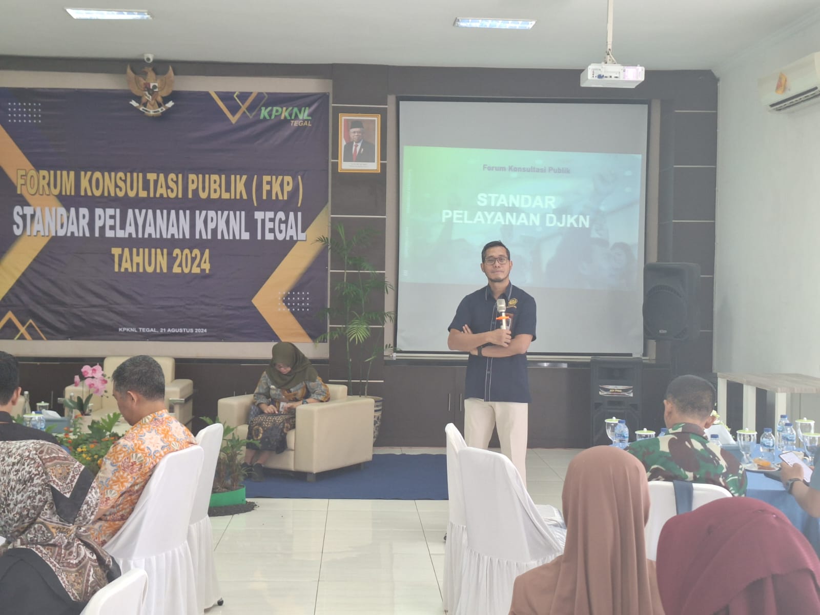 KPKNL Tegal melaksanakan Forum Konsultasi Publik (FKP) Standar Pelayanan KPKNL Tegal yang dilaksanakan pada hari Rabu, tanggal 21 Agustus 2024 pukul 10.00 s.d. 12.00 WIB bertempat di Aula KPKNL Tegal, mengundang para pengguna layanan pada KPKNL Tegal. Kegiatan Forum Konsultasi Publik dibuka oleh Kepala KPKNL Tegal, Hermawan Sukmajati, yang menyampaikan tujuan kegiatan ini adalah dalam rangka meminta saran dan usulan dari publik terkait standar pelayanan yang dilakukan oleh KPKNL Tegal kepada seluruh pengguna layanan. Selanjutnya adalah penyampaian materi oleh Anwar Hidayat, selaku Kepala Seksi Kepatuhan Internal, yang menyampaikan Survei Kepuasan Pengguna Layanan KPKNL Tegal bertujuan untuk mengukur indeks kepuasan pengguna layanan pada masing-masing layanan di KPKNL Tegal. Informasi mengenai prinsip standar pelayanan yang ada di kpknl tegal, komponen dari standar pelayanan yang ditetapkan, gambaran umum layanan DJKN pada KPKNL Tegal, sarana dan prasarana serta fasilitas, rincian pelayanan serta saluran pengaduan yang tersedia di KPKNL Tegal.