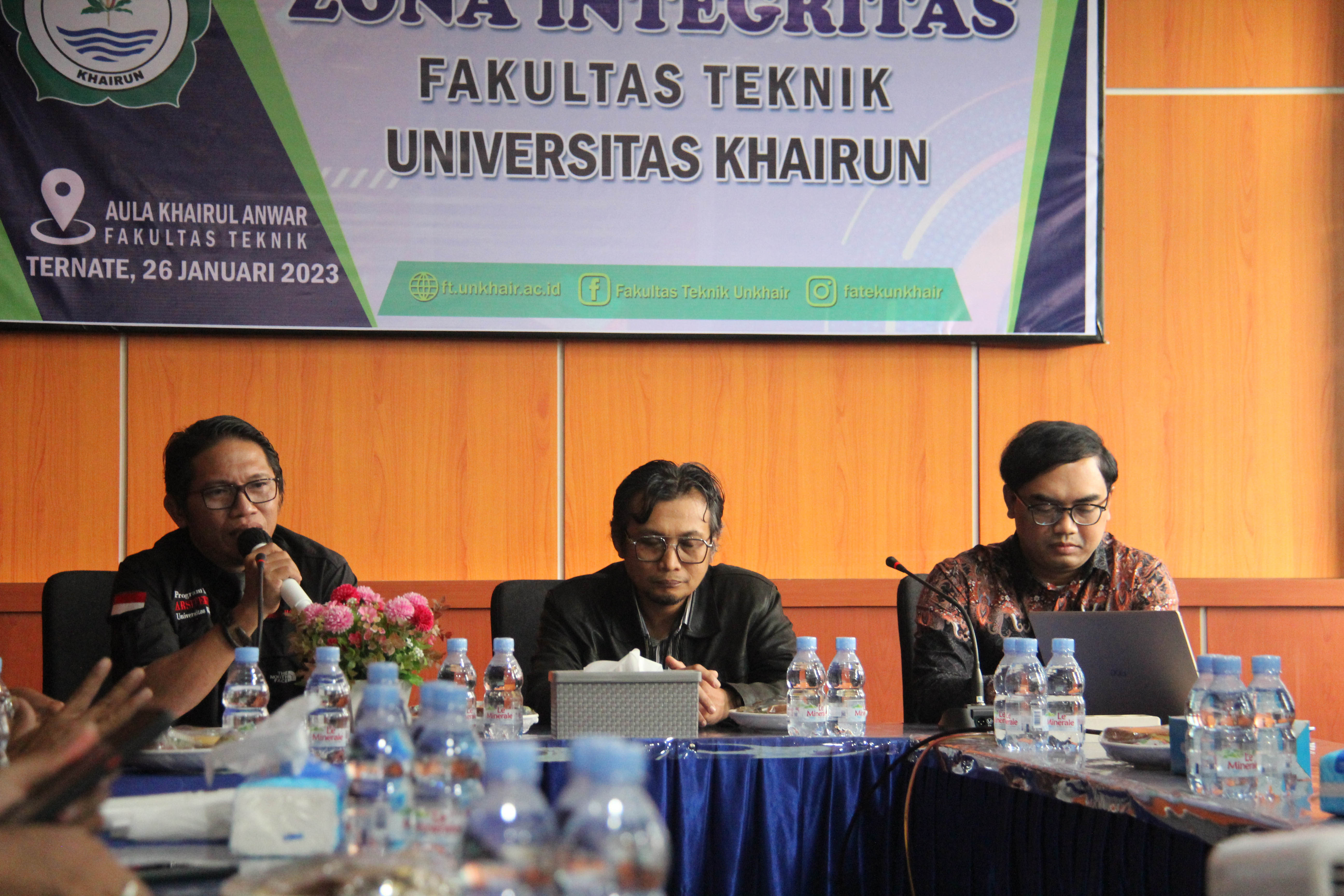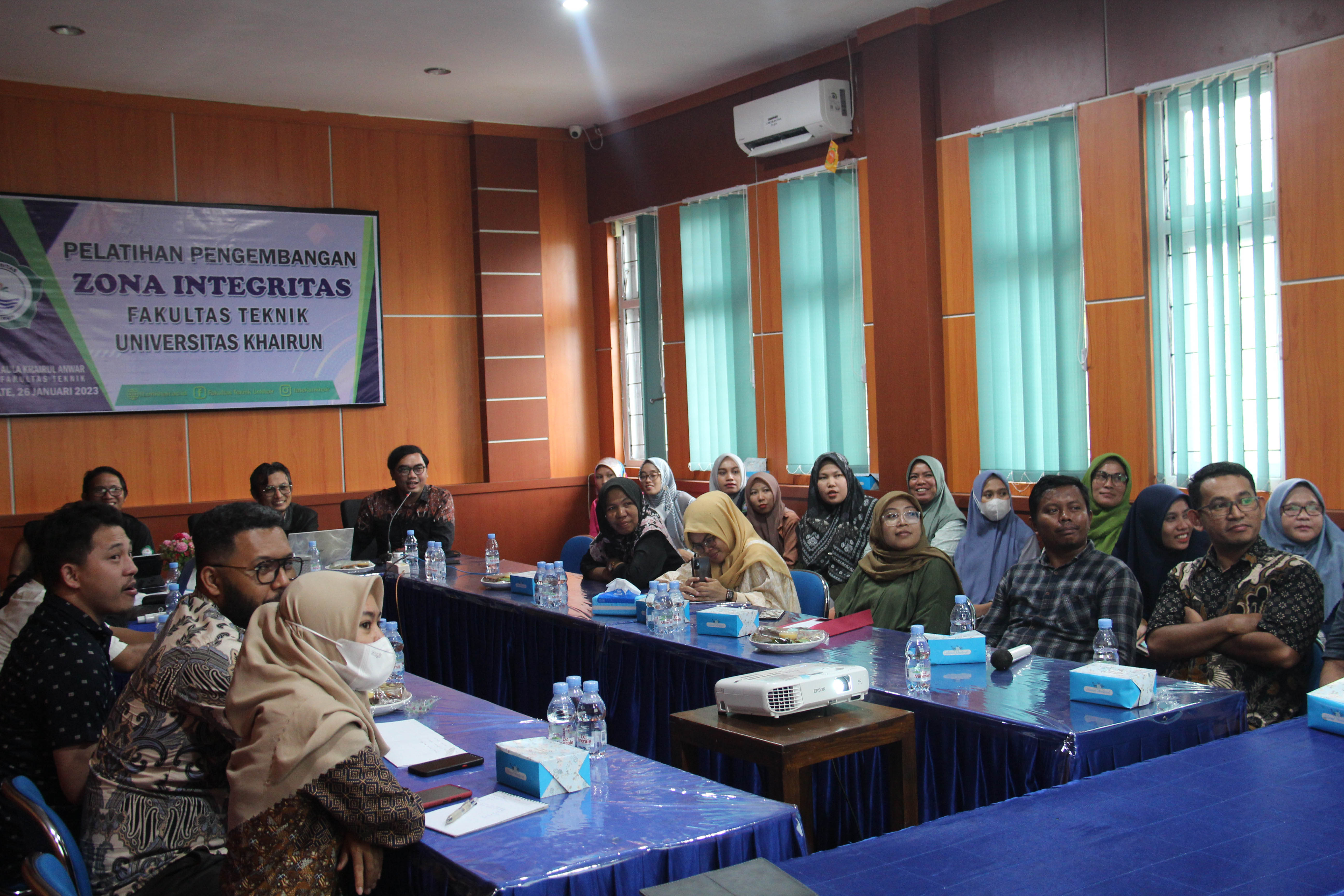 Ternate - Fakultas Teknik Universitas Khairun melakukan pelatihan Pembangunan Zona Integritas (ZI) menuju Wilayah Bebas dari Korupsi (WBK)/Wilayah Birokrasi Bersih dan Melayani (WBBM) pada Kamis (26/1) yang dihadiri oleh Dekan Fakultas Teknik dan civitas akademik Fakultas Teknik Universitas Khairun. Pelatihan tersebut dibuka langsung oleh Dekan Fakultas Teknik Universitas Khairun, Endah Harisun, S.T., M.T. "Selain karena sudah dipersiapkan oleh universitas sebagai fakultas pilihan yang memiliki zona integritas, inti dari integritas ini adalah suatu sikap atau budaya yang konsisten antara perbuatan dan perkataan terutama menyangkut suatu instansi, sehingga zona integritas merupakan suatu keharusan bagi kami" ucap Endah Harisun saat membuka acara pelatihan.