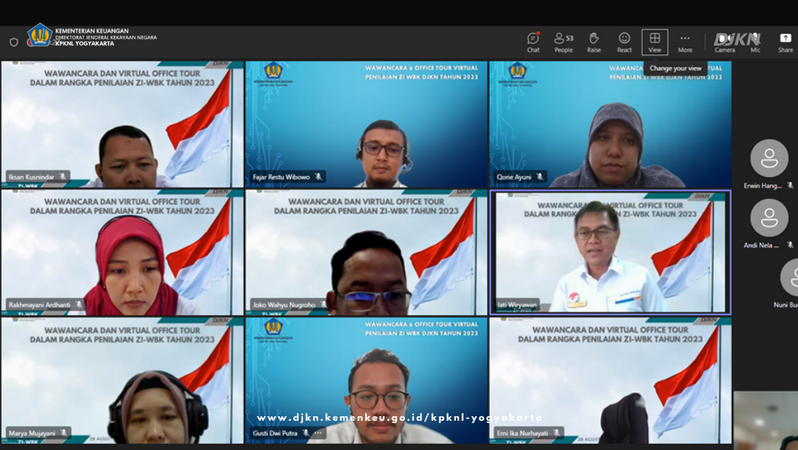 Yogyakarta - Kantor Pelayanan Kekayaan Negara dan Lelang (KPKNL) Yogyakarta mengikuti wawancara dan virtual office tour dengan Inspektorat IV Kementerian Keuangan selaku Tim Penilai Kementerian di lingkungan Direktorat Jenderal Kekayaan Negara dan Badan Kebijakan Fiskal pada Senin, 28 Agustus 2023, secara daring melalui Aplikasi Teams Meeting. Kegiatan tersebut dilaksanakan setelah KPKNL Yogyakarta lulus pada tahap pra-evaluasi dan merupakan rangkaian kegiatan penilaian Zona Integritas-Wilayah Bebas dari Korupsi (ZI WBK) tahun 2023.