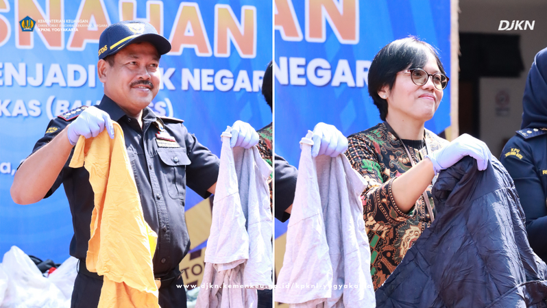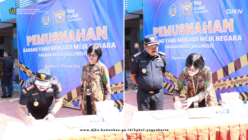 Yogyakarta – Selasa (26/03), Kepala KPKNL Yogyakarta, Tuti Kurniyaningsih serta Kasi Pengelolaan Kekayaan Negara J. Kristianto Rahardjo menyaksikan kegiatan pemusnahan barang larangan dan pembatasan (lartas) impor berupa pakaian bekas. Acara yang dipimpin langsung oleh Tedy Himawan Kepala KPPBC TMP B Yogyakarta merupakan tidak lanjut atas permohonan persetujuan pemusnahan barang milik negara yang telah disetujui oleh KPKNL sebagai pengelola barang milik negara.