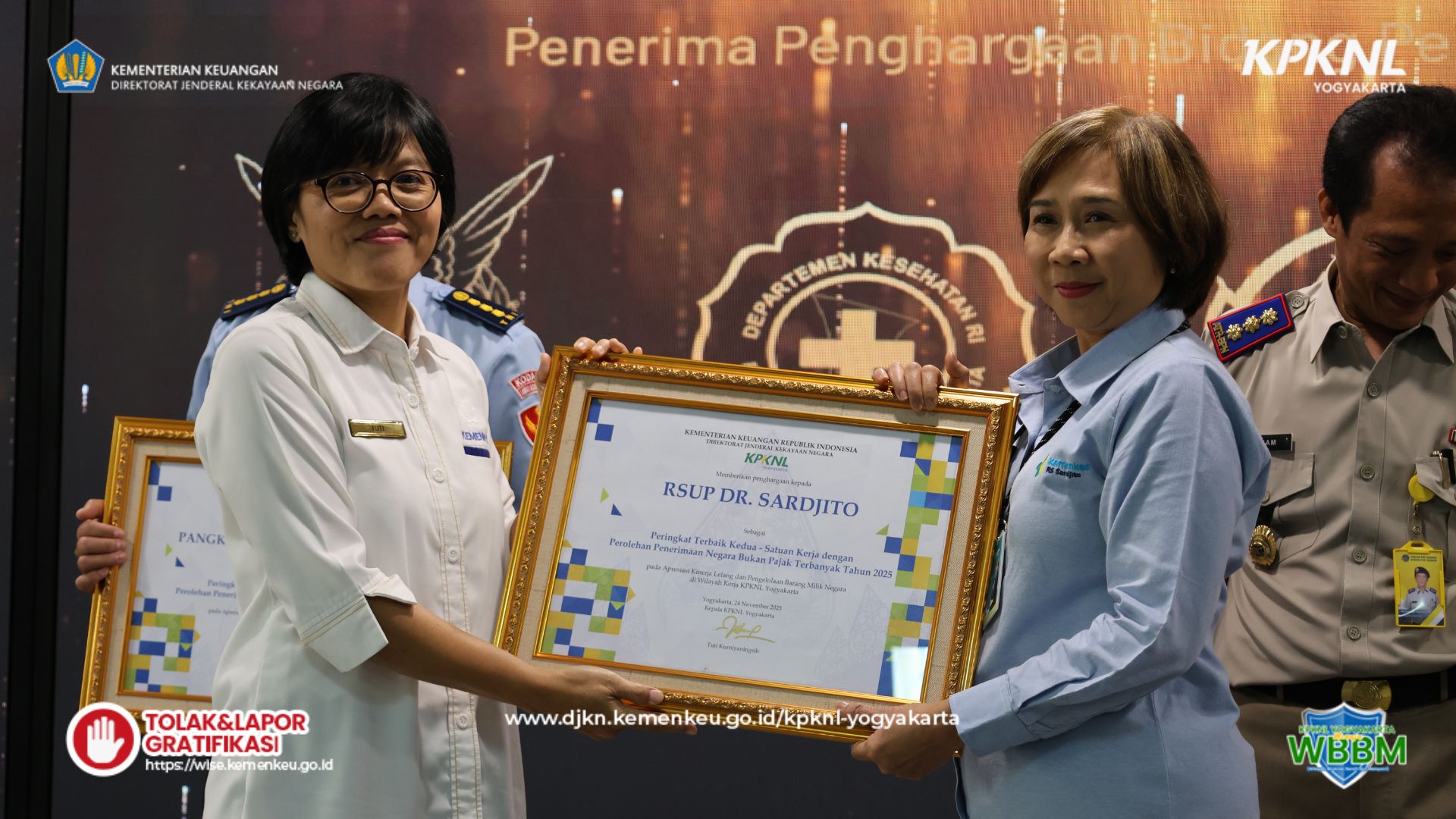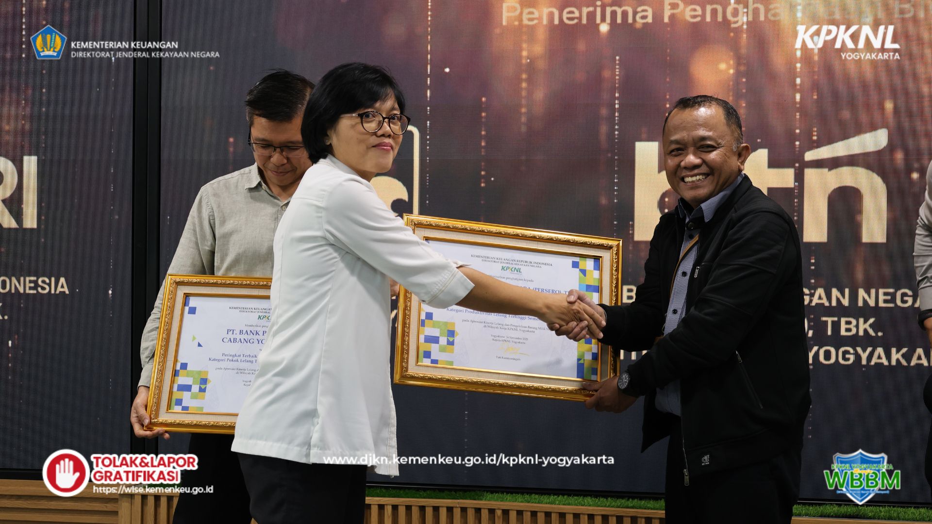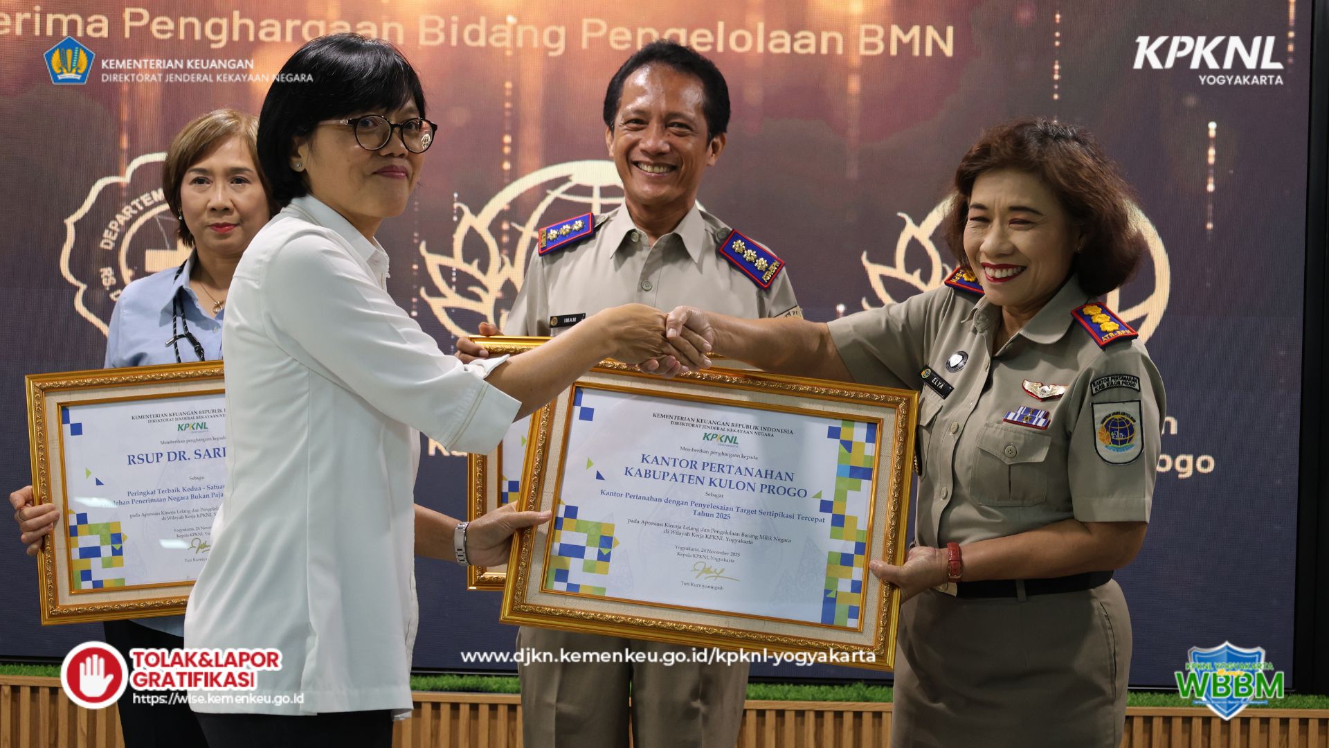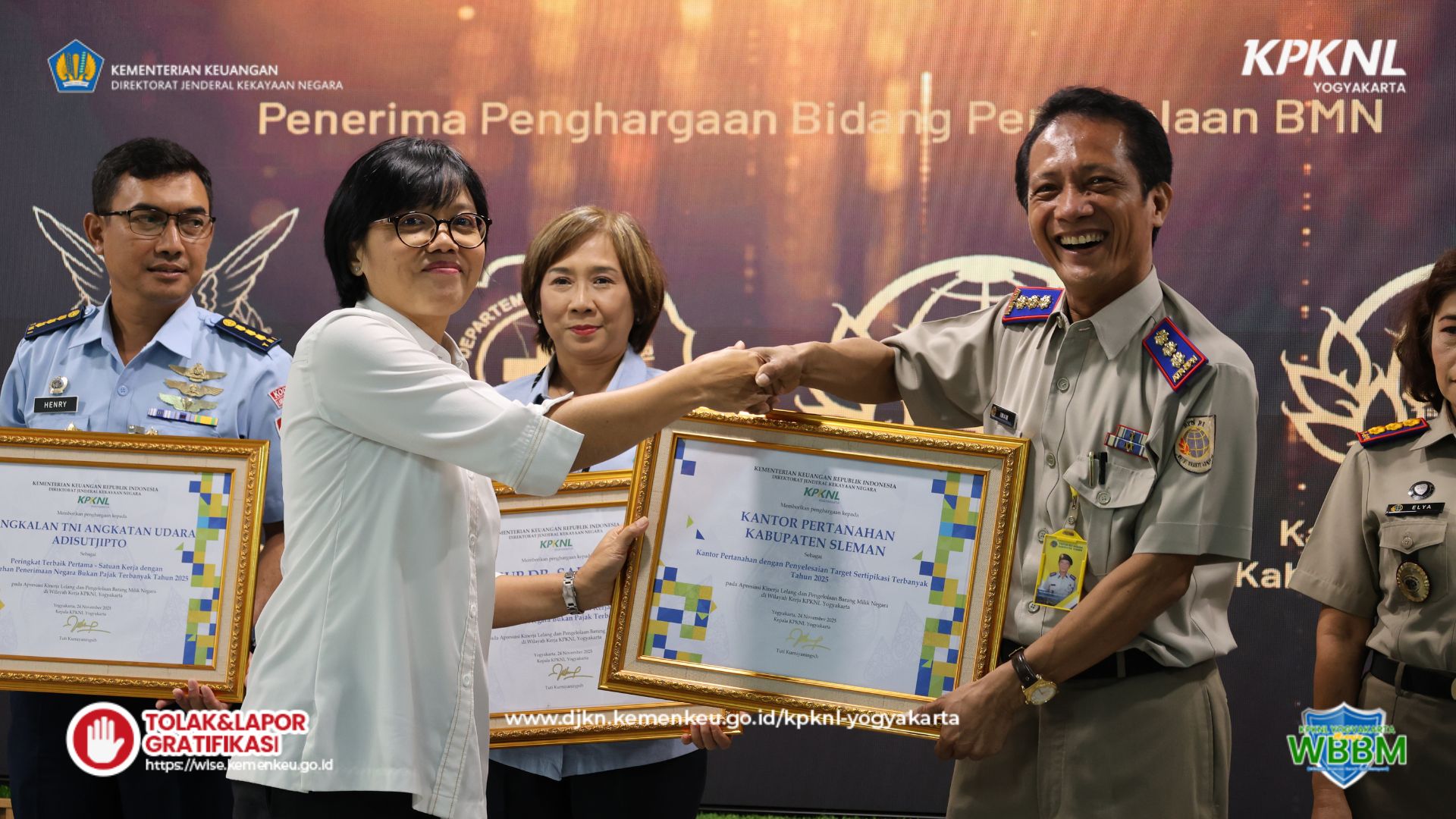 Pada sesi berikutnya, Kepala KPKNL Yogyakarta menyerahkan penghargaan kepada satuan kerja dengan perolehan PNBP terbanyak pada tahun 2025 serta kepada kantor pertanahan yang berhasil menyelesaikan target sertipikasi. Adapun para penerima penghargaan adalah sebagai berikut: