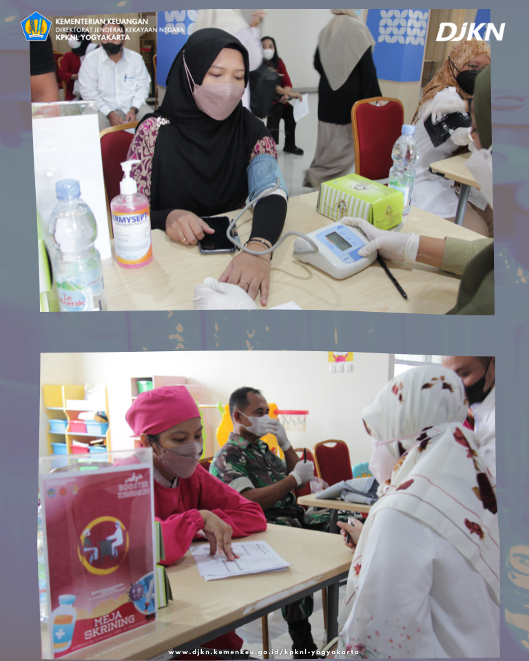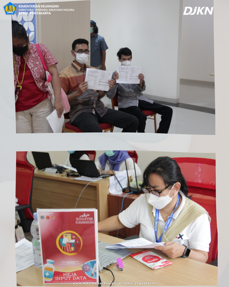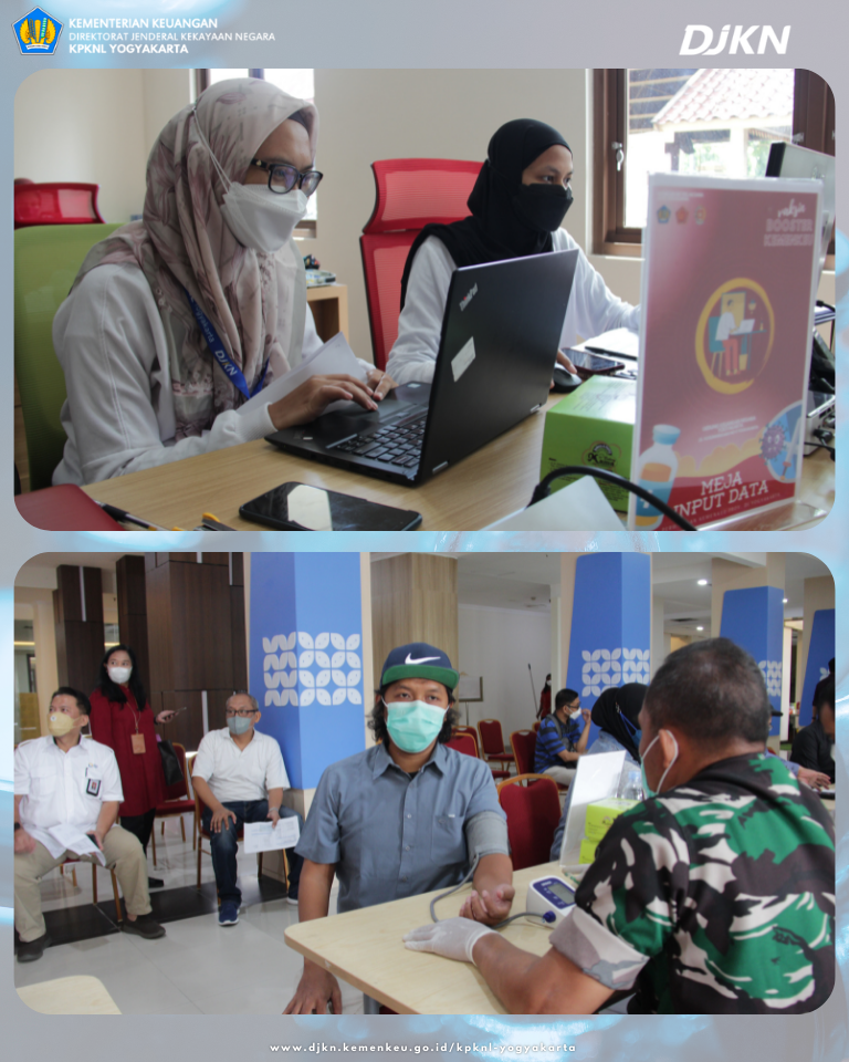 KPKNL Yogyakarta khususnya, turut berpartisipasi pada pelaksanaan vaksin booster dengan mengambil bagian sebagai panitia pelaksanaan vaksin booster dan tentunya seluruh pegawai dan keluarga KPKNL Yogyakarta (diutamakan lansia) yang sudah memenuhi syarat, didaftarkan sebagai penerima vaksin booster.